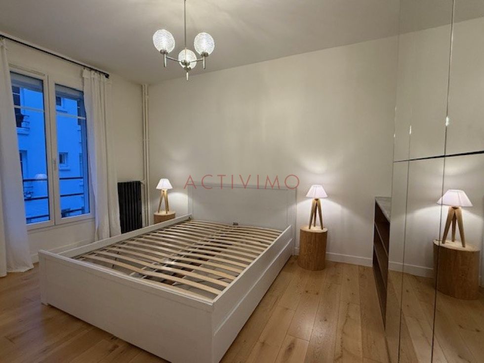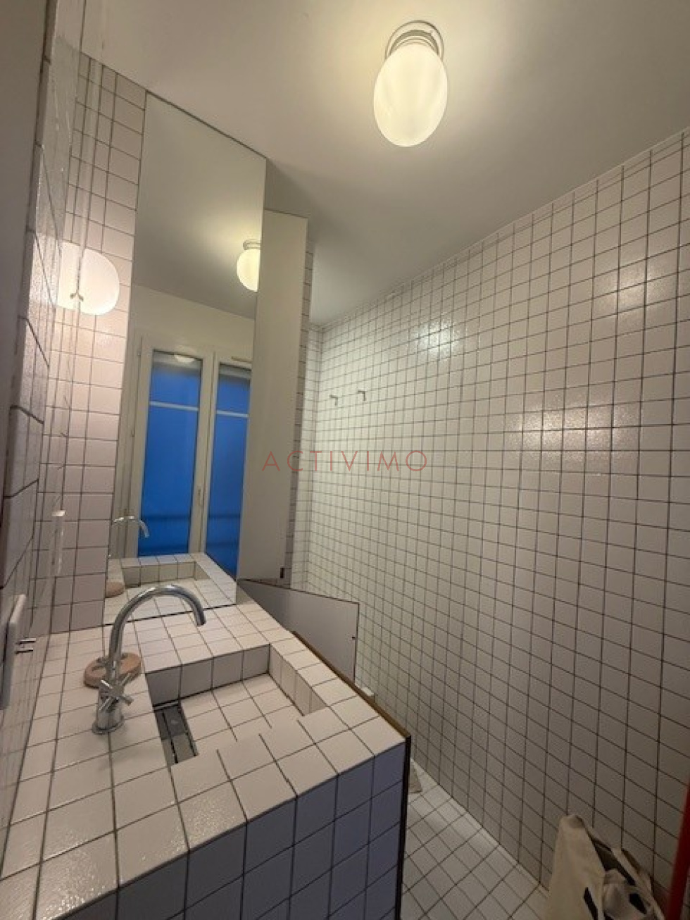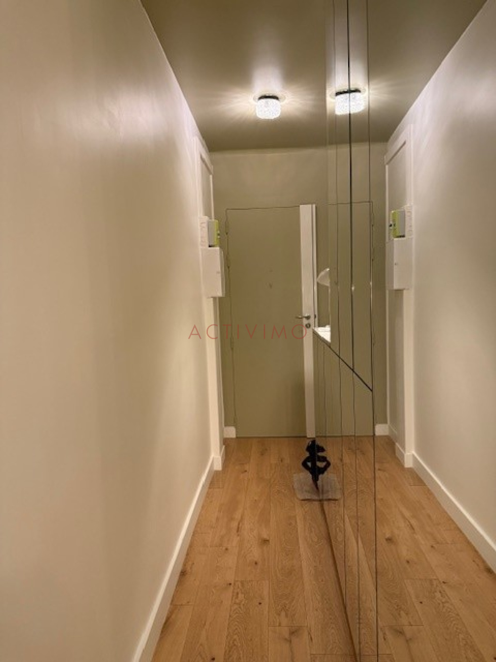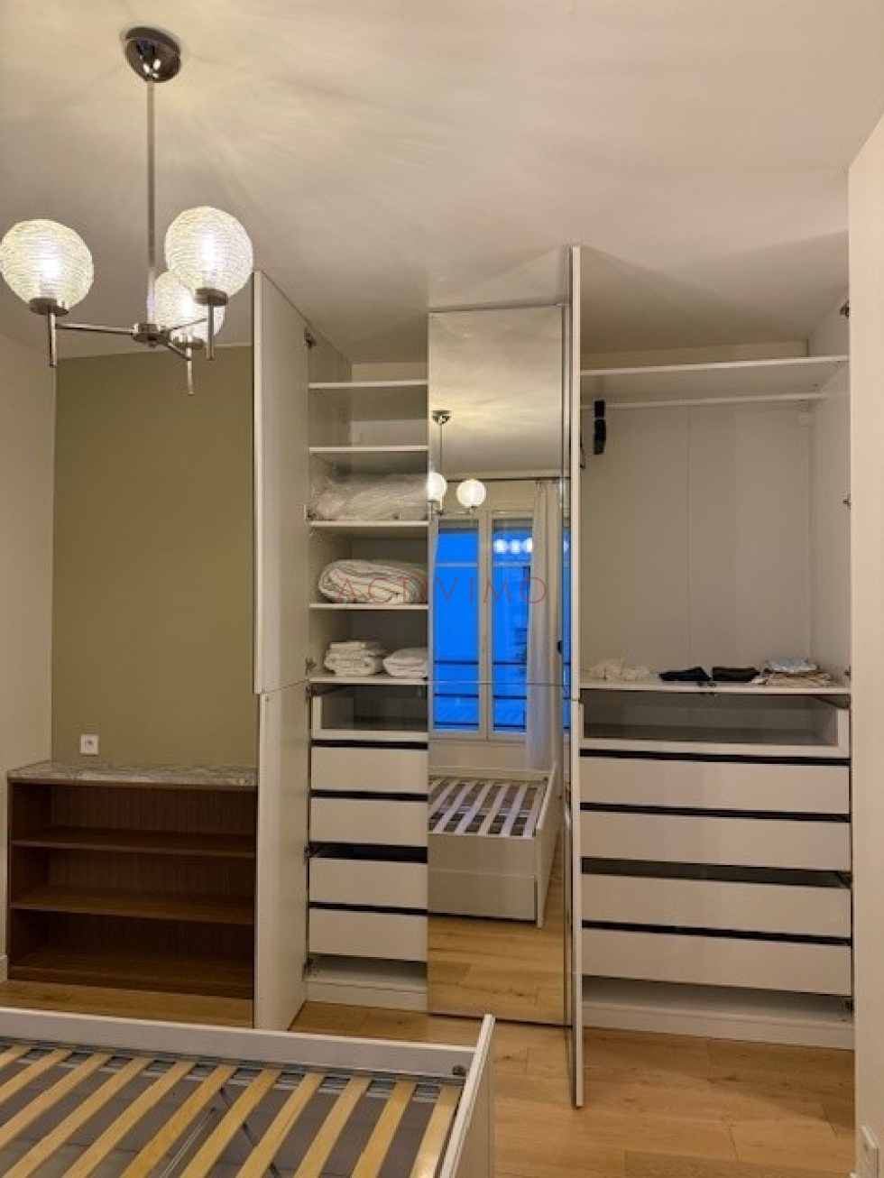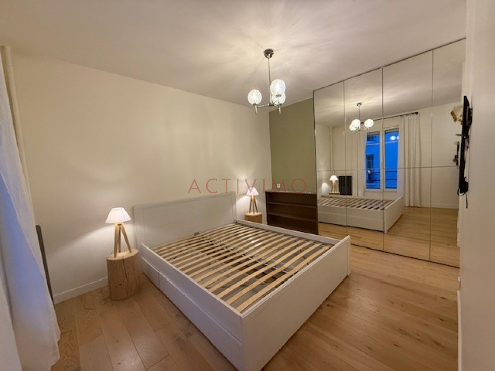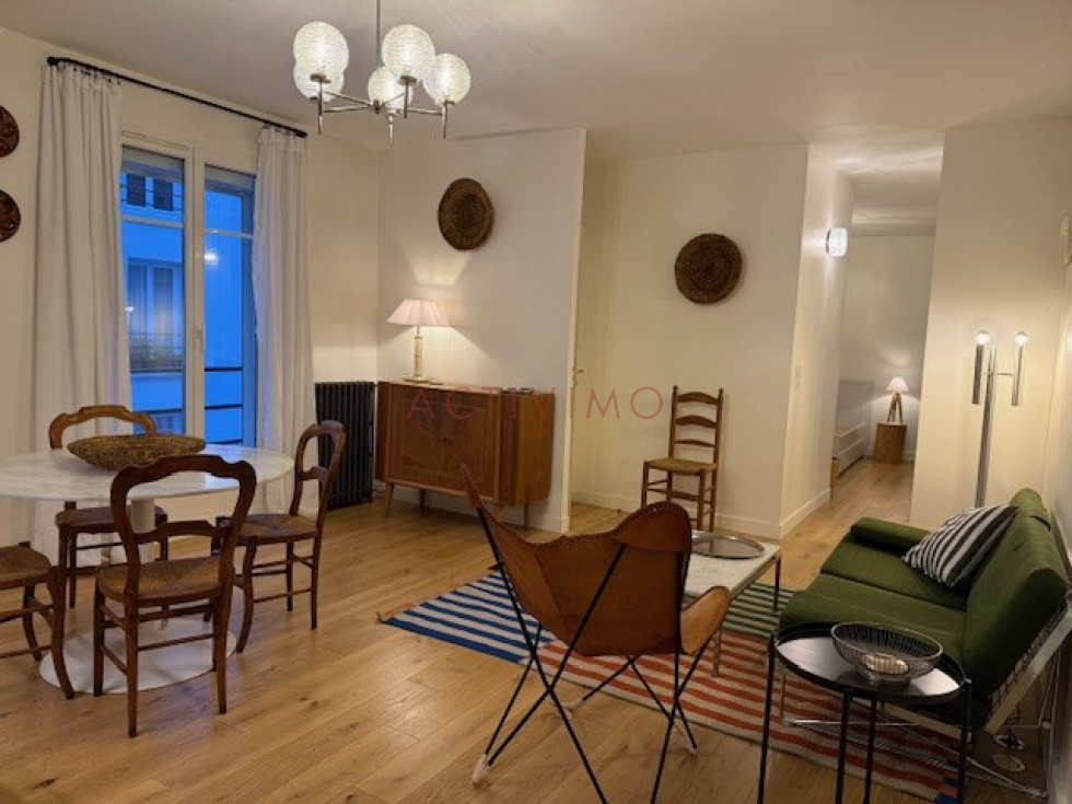 Quartier Pyrénées/Belleville/Place des Fêtes, au 3ème étage avec petit ascenseur d'un immeuble années 1930 sécurisé avec digicode, interphone et gardien, Beau 2 pièces de 45 m² loué meublé composé d'une entrée avec rangements, une pièce principale sur cour avec cuisine américaine aménagée et équipée (plaques, hotte, réfrigérateur, lave-vaisselle, lave-linge), une chambre avec grands placards, une salle de douche avec fenêtre, un wc séparé avec fenêtre. Possibilité de louer un box à proximité rue de Belleville en sus. Meublé avec beaucoup de goût, appartement en excellent état. Chauffage et eau chaude inclus dans les charges, double vitrage, DPE E. Disponible le 15 Décembre.